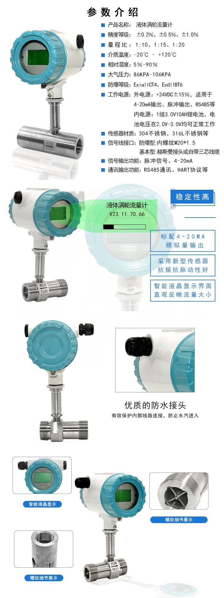 液體渦輪流量計結構為防爆設計,可以顯示流量總量,瞬時流量和流量滿度百分比。